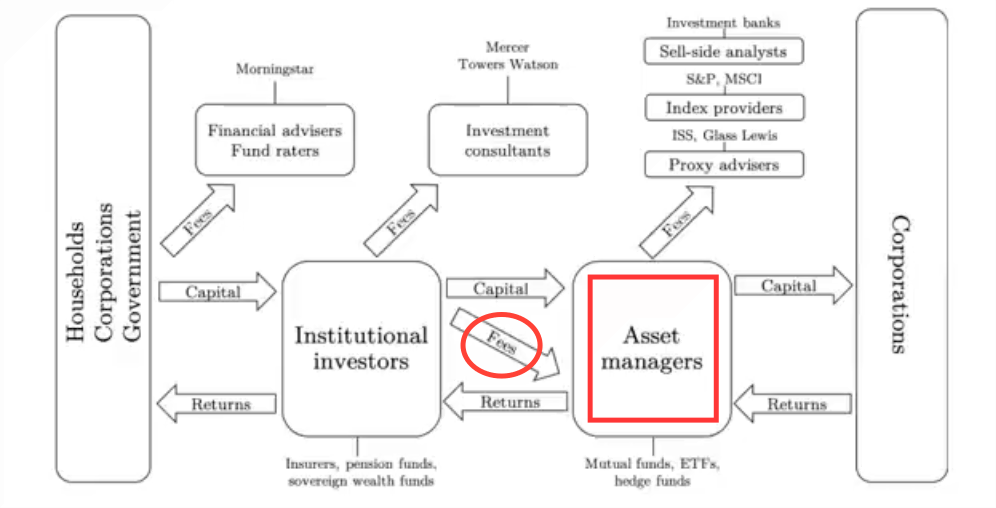 Asset management results in wealth preservation for those who already own assets, overriding the original entrepreneurial function and efficient allocation of capital of the market, focusing on shareholder payouts based on corporate debt and undercutting the investment needed in decarbonisation or changes to unsustainable and unjust supply chains. [2]