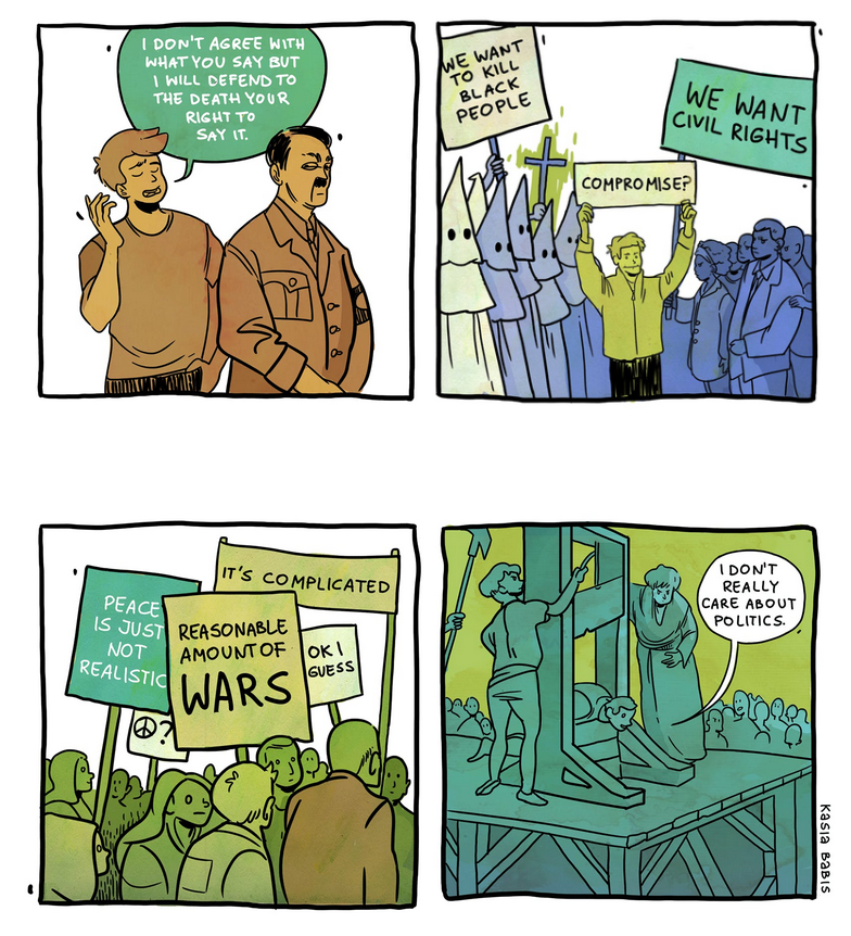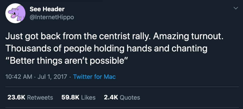 Self-identifying as a centrist is perhaps the most cynical and amoral political identity you can have because you're just openly admitting your beliefs aren't really beliefs they're just strategic positions that only exist relative to others in the room you happen to be in