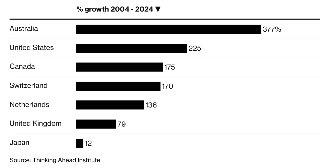 Superannuation (pension funds) are currently worth approximately USD 63 trillion. This is around 55% of market capitalisation of all listed domestic companies (USD 114 trillion).