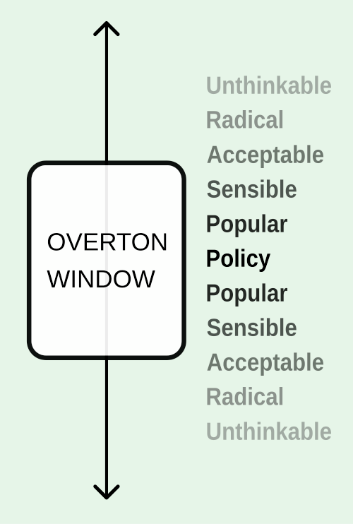 The Overton window, or window of discourse, refers to the topics of discussion or debate that are considered to be politically acceptable to the majority of the population at a particular point in time. The window changes over time and can move, or broaden or narrow, and demonstrates "the slow evolution of societal values and norms."