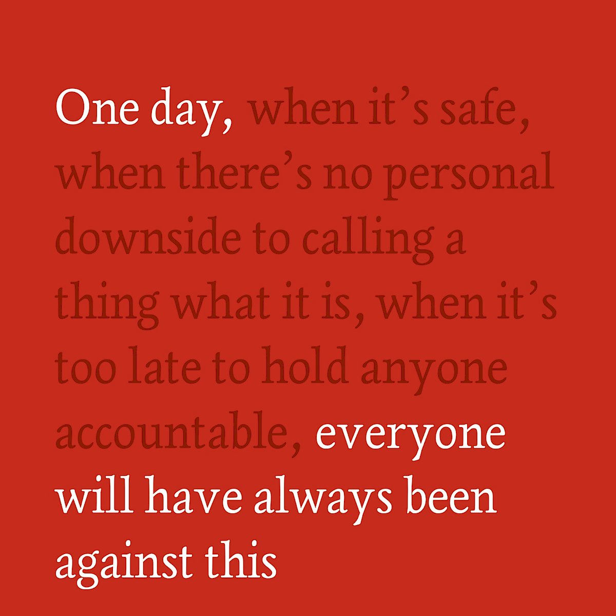 "One day, when it's safe, when there's no personal downside to calling a thing what it is, when it's too late to hold anyone accountable, everyone will have always been against this." - Omar El Akkad